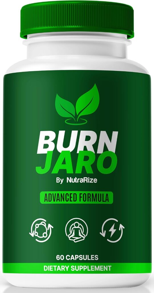 Burn Jaro is presented as a weight loss supplement aimed at boosting metabolism and fat burning, featuring a blend of ingredients like Cinnamon and Green Tea Extract. The label lists 600 µg of Folate, 240 µg of Vitamin B12, and 833 mg of a mysterious blend.
